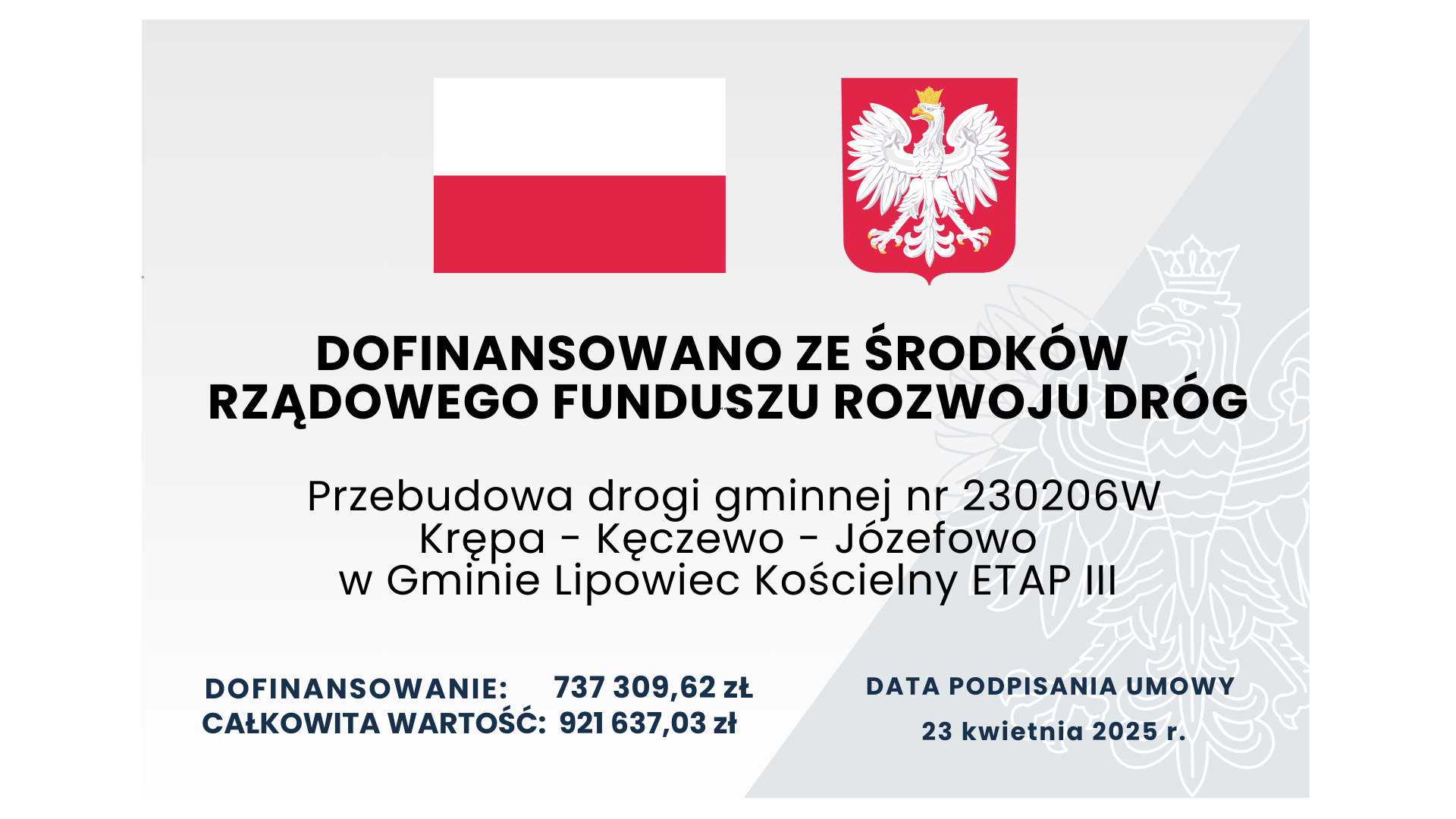 Rządowy Fundusz Rozwoju Dróg na 2025r. - Przebudowa drogi gminnej nr 230206W Krępa – Kęczewo - Józefowo w Gminie Lipowiec Kościelny ETAP III