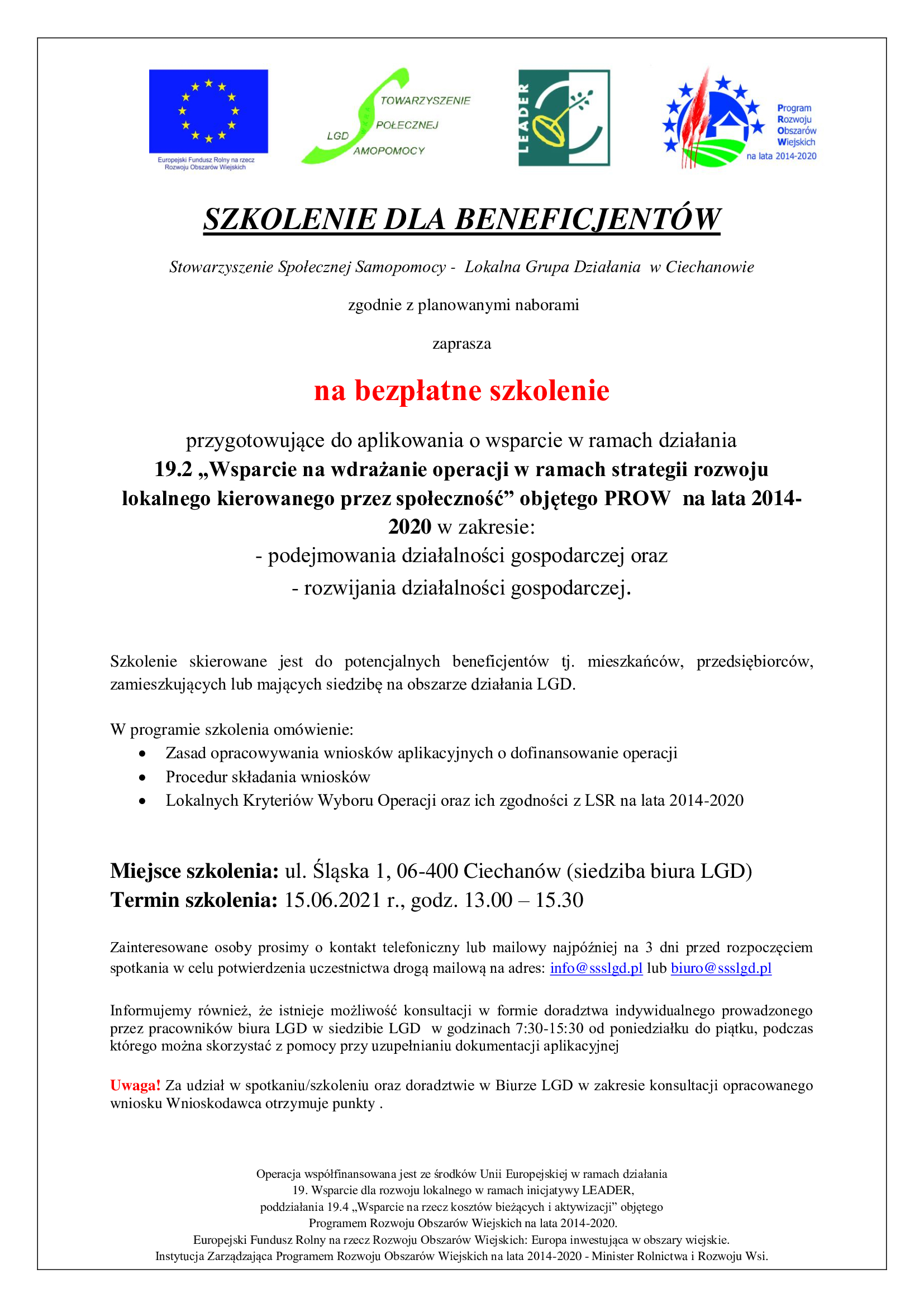W związku z powyższym zapraszamy na szkolenia dla Beneficjentów i uprzejmie prosimy o zamieszczenie takiej informacji na Państwa stronie www (treści ogłoszeń w załączniku)