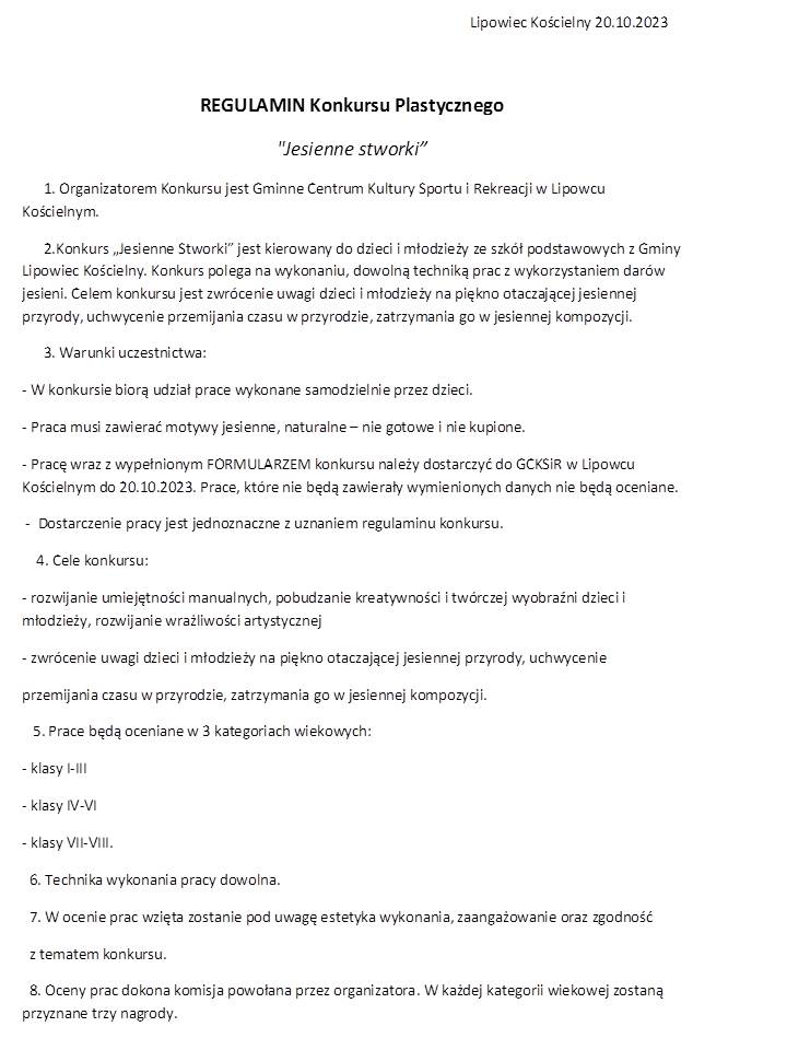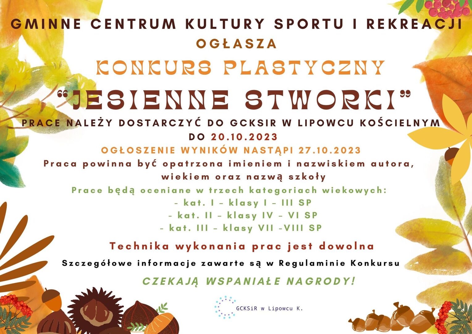 Zaproszenie GCKSiR w Lipowcu Kościelnym do udziału w konkursie plastycznym JESIENNE STWORKI
