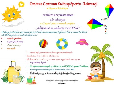 ZAPROSZENIE NA PÓŁKOLONIE LETNIE W GCKSiR w Lipowcu kościelnym